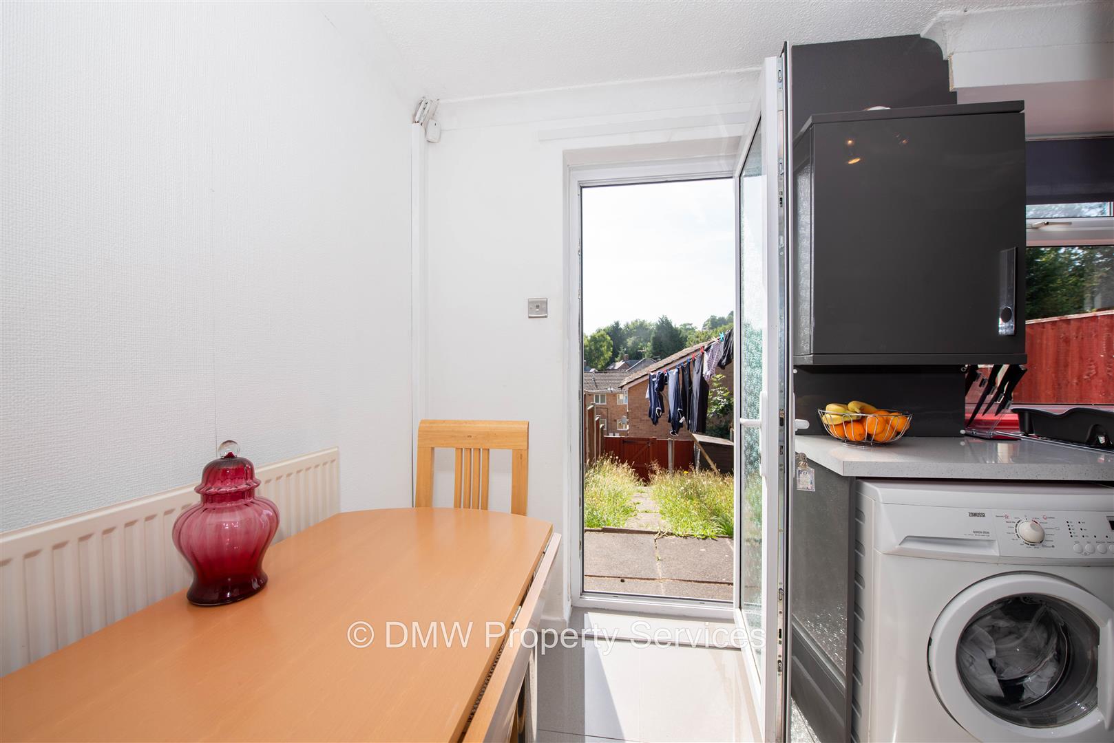 Modern range of base and wall units with integrated oven, microwave and dishwasher. Washing machine. Electric hob with extractor over. Sink. Tiled flooring. Window and door to the rear.