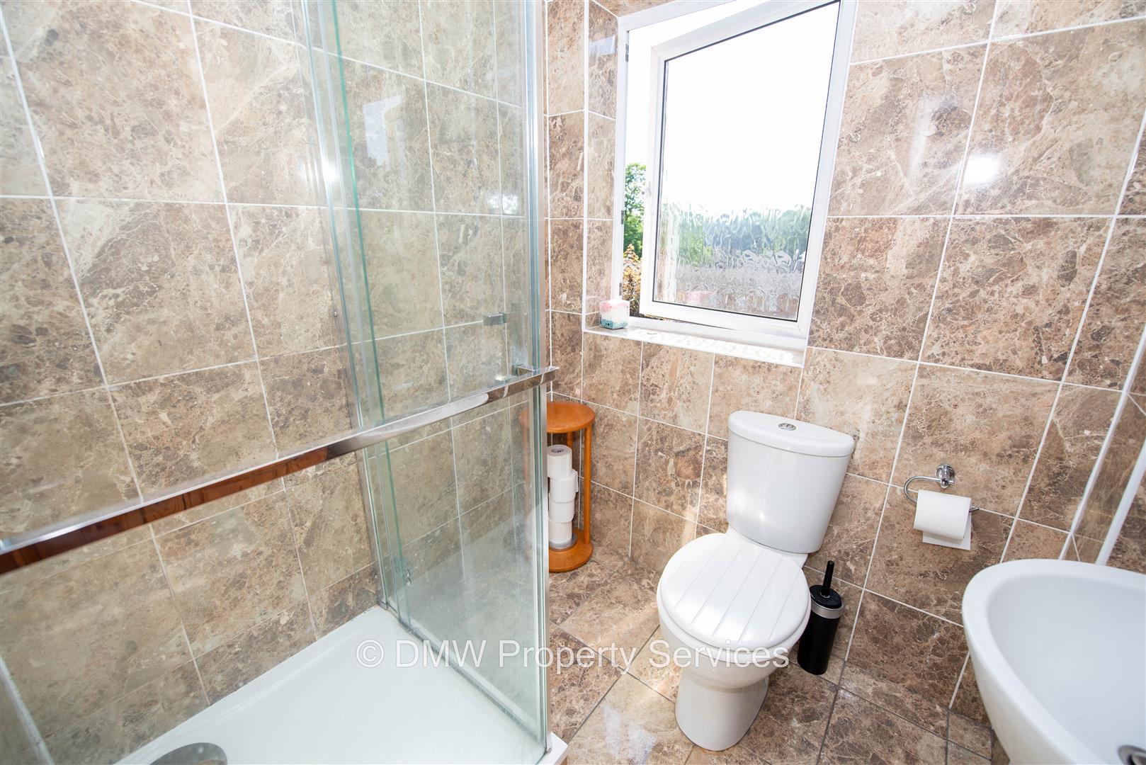 Tiled floors and walls. Shower with mains water mixer. Low level flush toilet. Sink unit. Chrome towel radiator. Window to the rear.