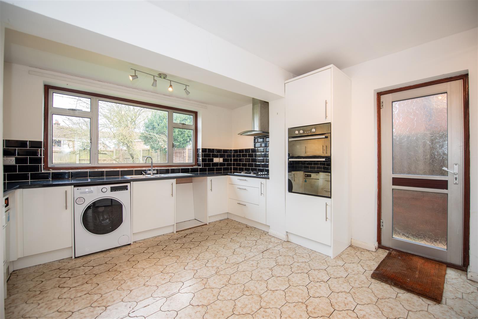 A range of base and wall units. Window to the rear. Door to the side elevation.