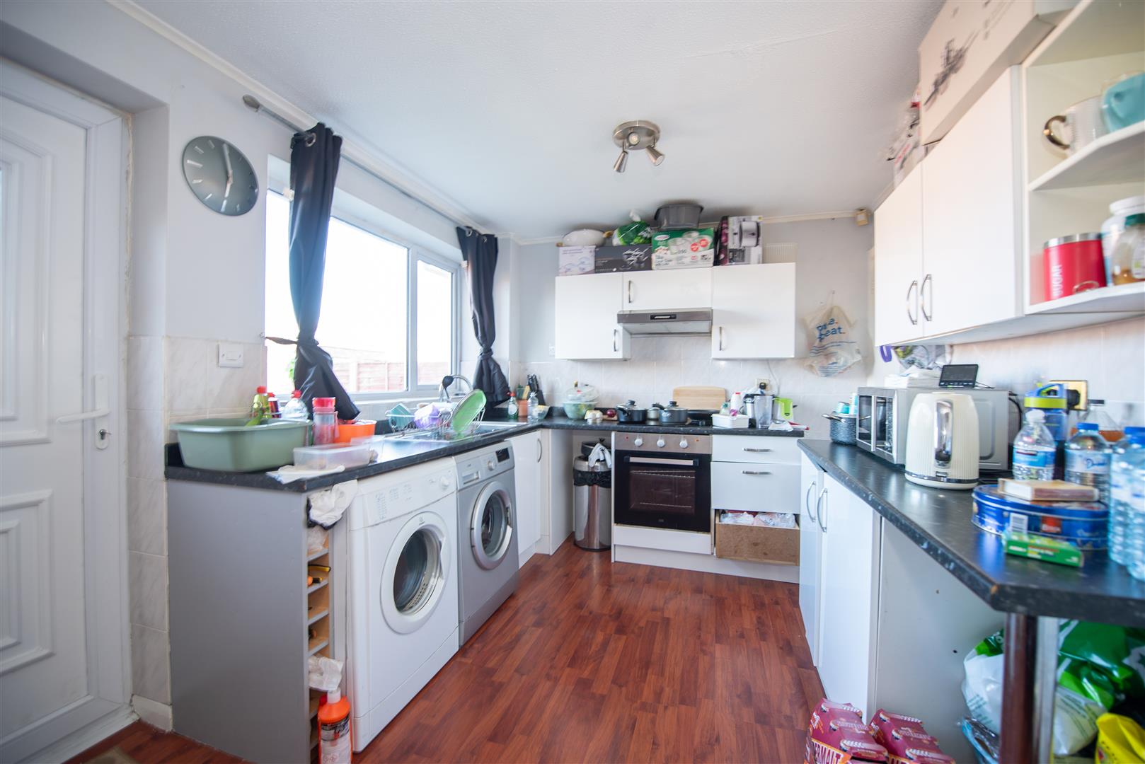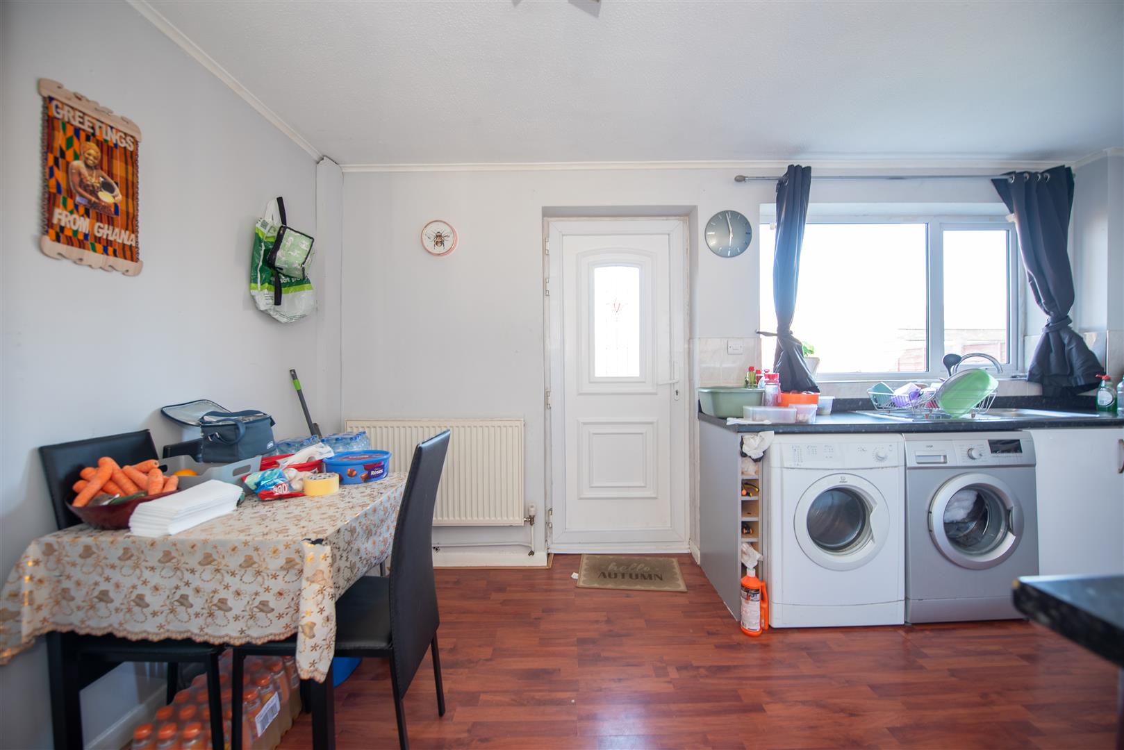 Laminate wood effect flooring. A range of base and wall units with integrated oven and plumbing for a washing machine and dishwasher. Radiator. Window and door to the rear elevation. Breakfast Bar.