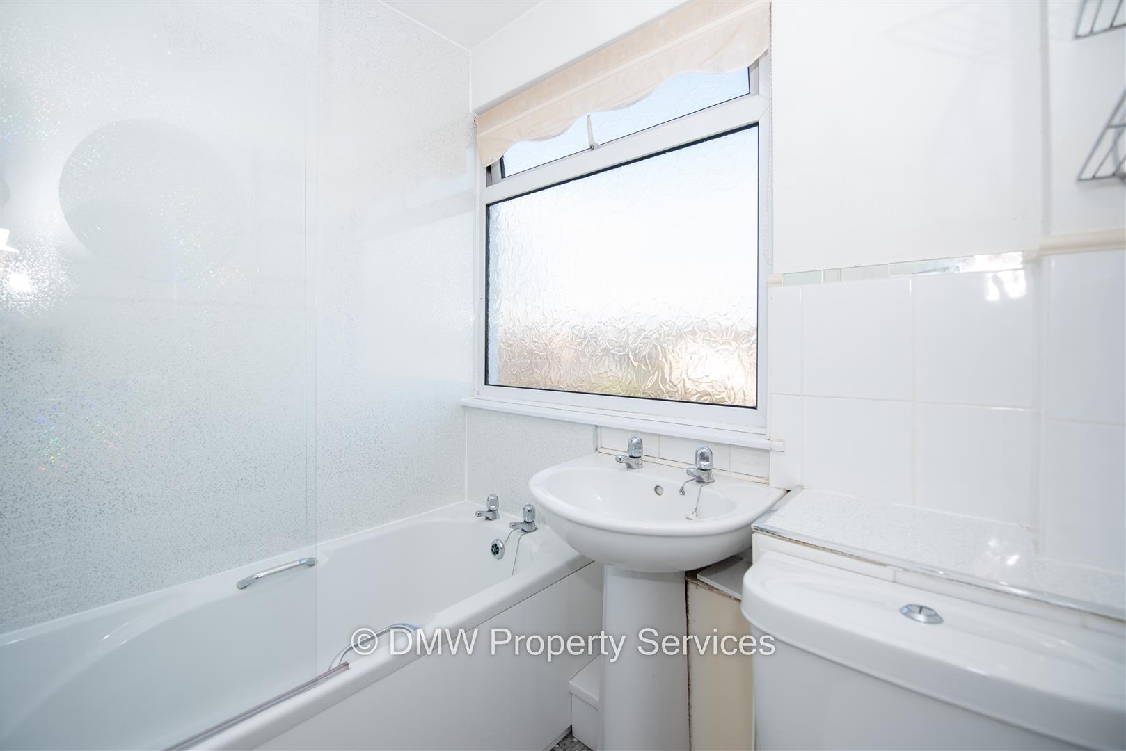 Window to the front elevation. Panelled bath with shower over. Pedestal wash hand basin. Low level flush toilet. Window to the rear.