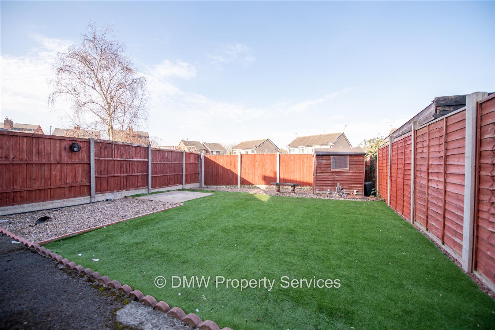 Fenced boundaries. Artificial grass. Large block paved driveway to the front.