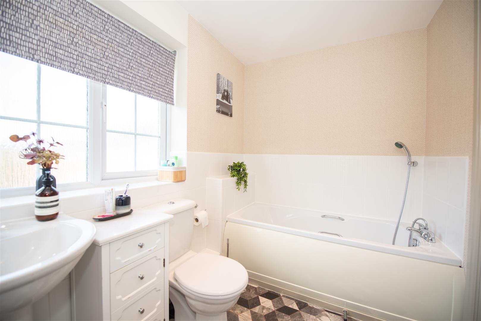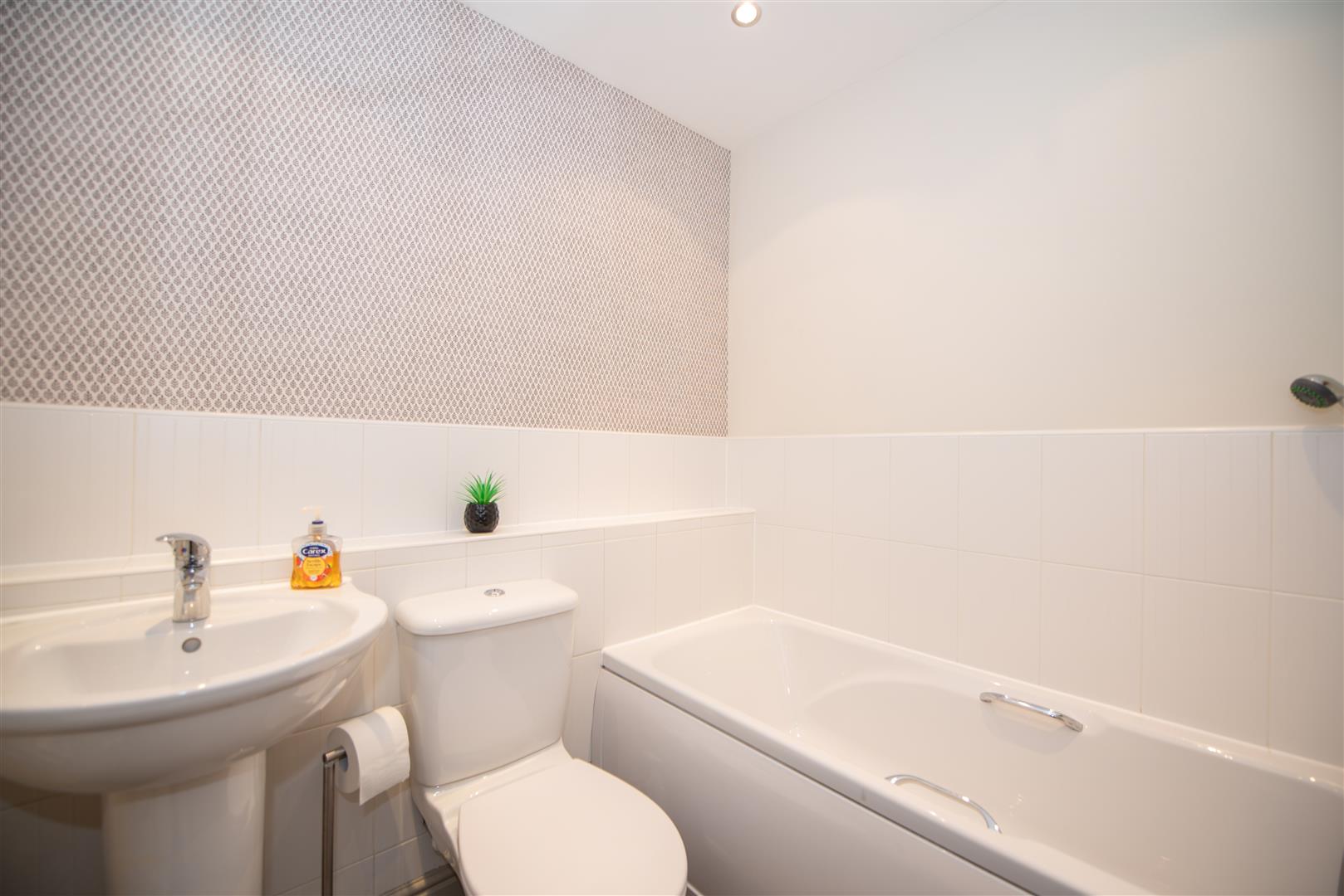Window to the front elevation. Built in shower. Bath, sink and toilet.
