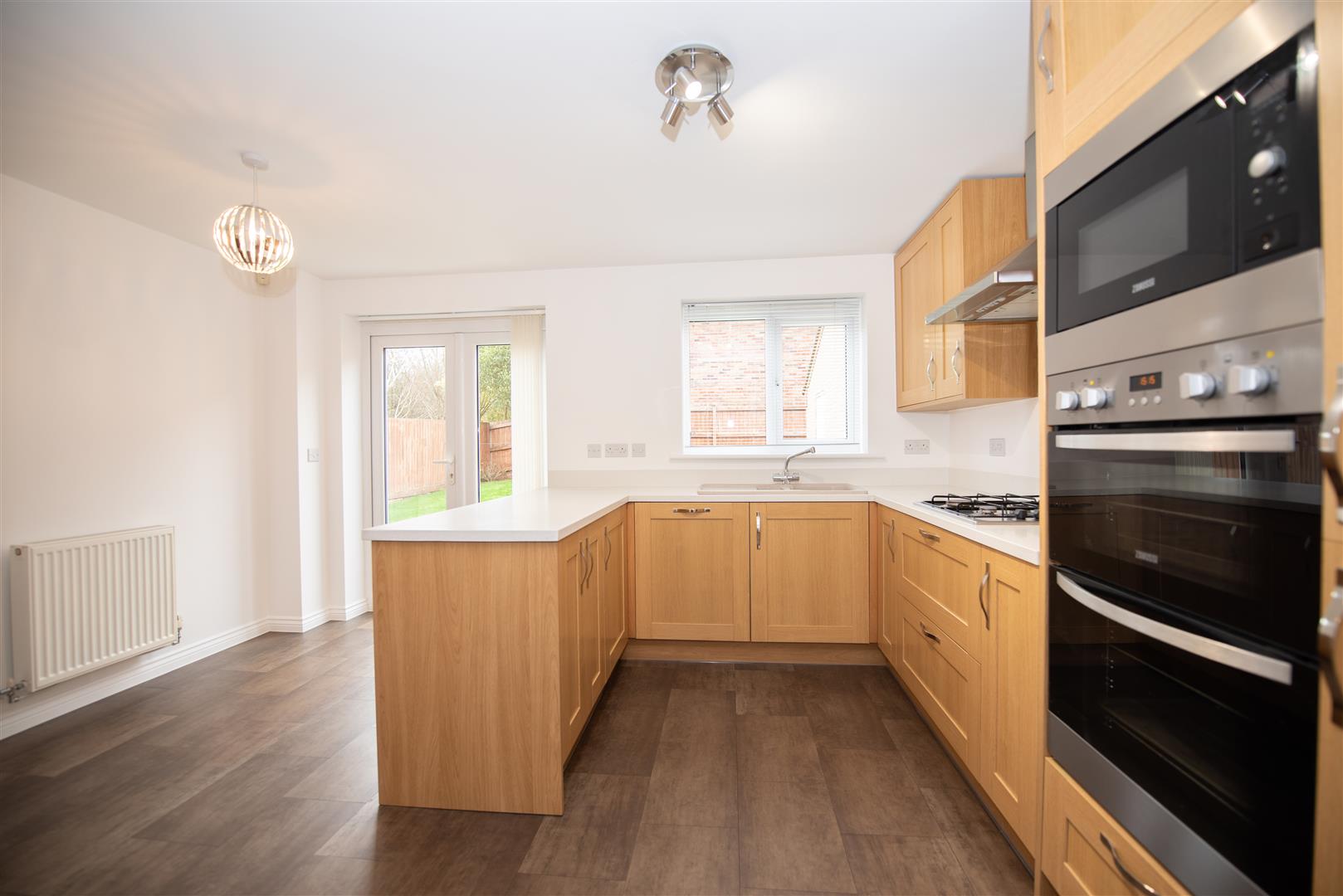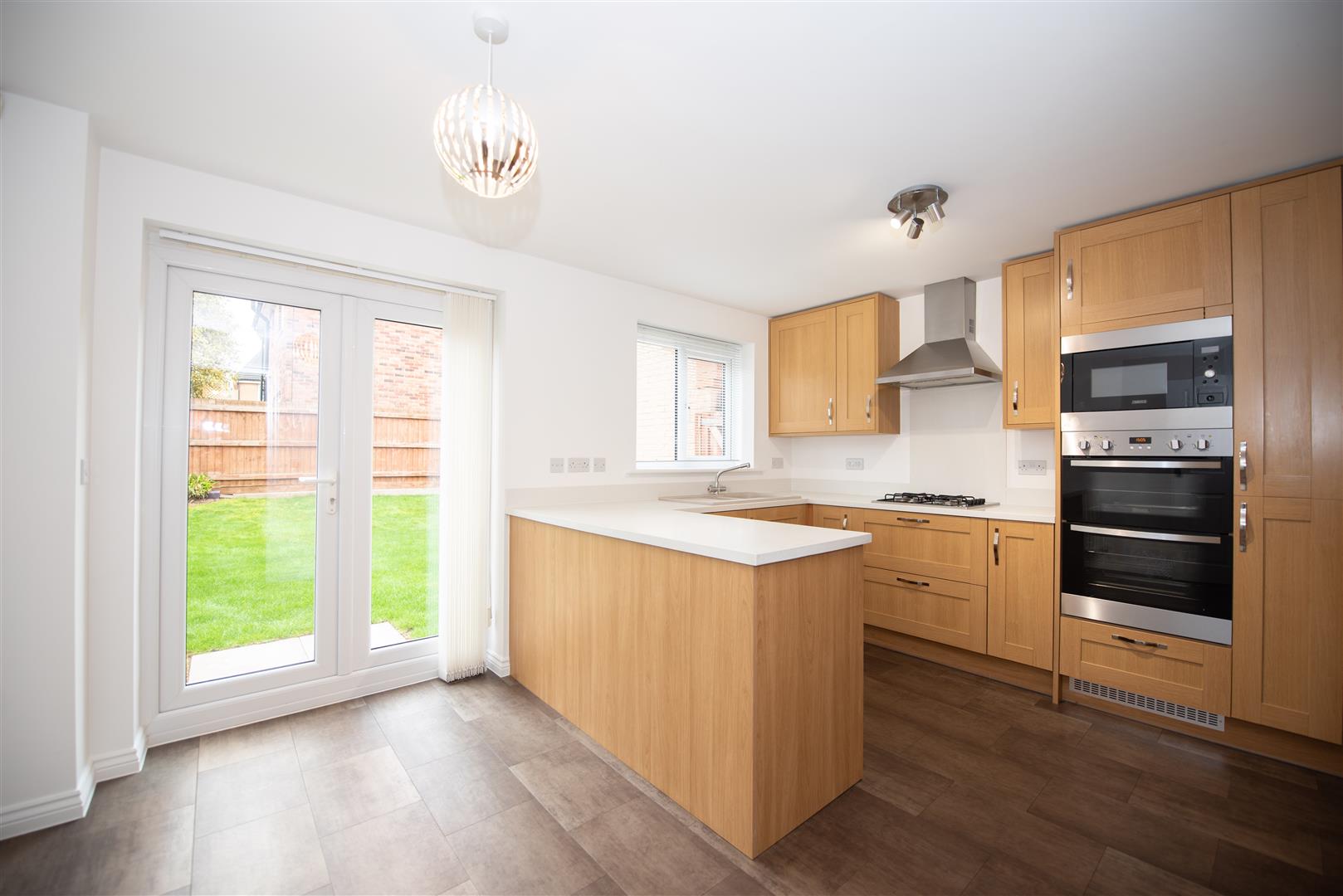 French doors to the rear elevation. A range of base and wall units with integrated appliances. Gas hob. Extractor. Double oven and microwave. Dishwasher. Door to the Utility Room.
