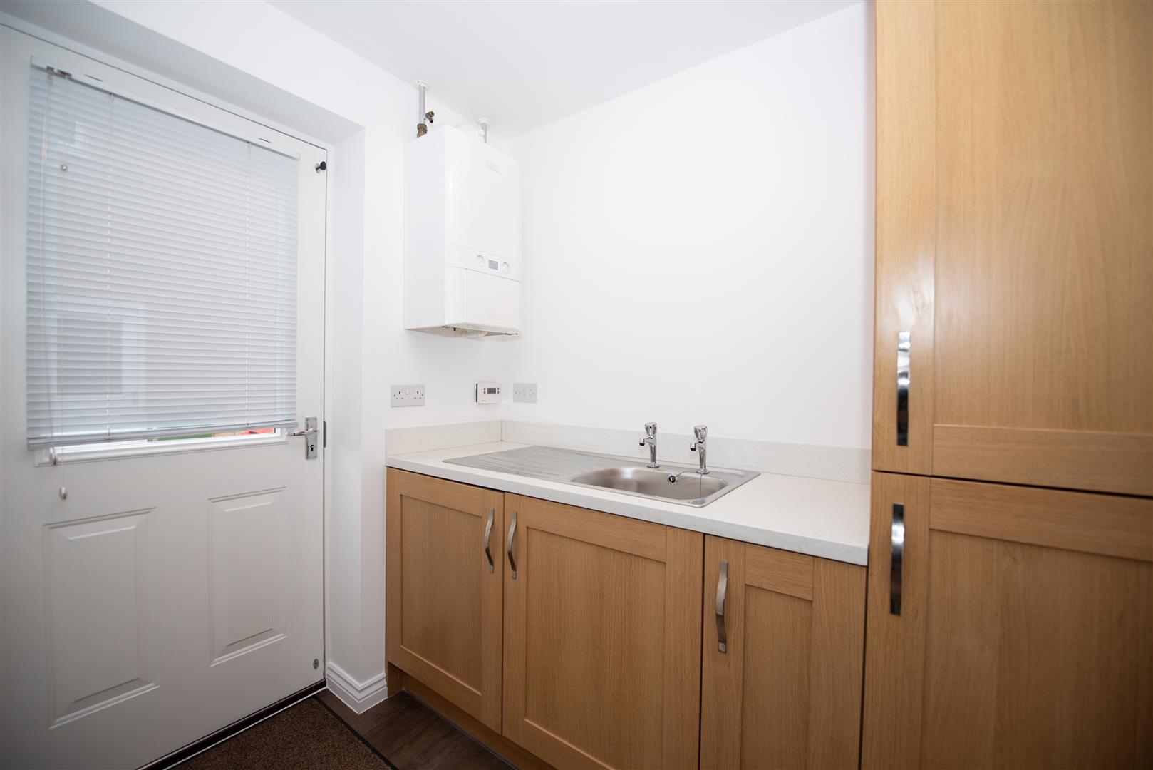 Door to the side. Wall mounted gas boiler. Sink unit. A range of cupboards. Washer/Dryer.